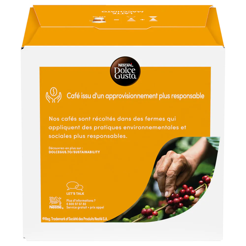 Le Dolce Gusto Latte Macchiato est une boisson gourmande à trois couches. Une base de lait chaud et onctueux est surmontée d'un espresso riche et d'une mousse de lait aérée et sucrée. C'est un mélange à la fois visuellement attrayant et délicieux, parfait pour un moment de plaisir à tout moment de la journée.